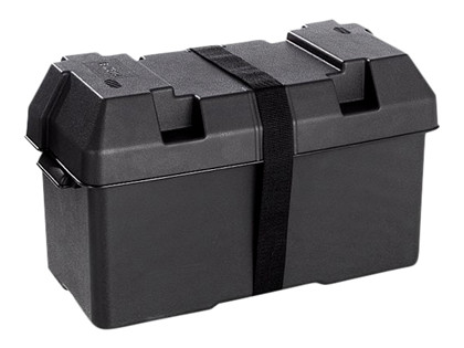 Beskytter batteriet og hindrer lækage. Med monteringsbeslag og rem. Konstrueret i syrefast plast.